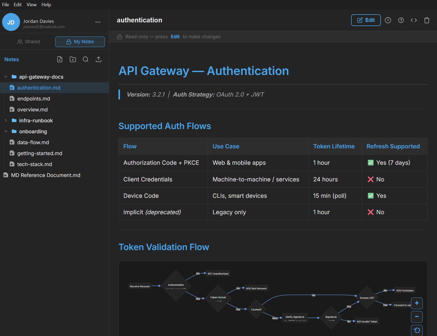 Live preview, syntax-highlighted code blocks, Mermaid diagrams, tables, task lists, and keyboard-first navigation — everything a developer expects in a notes tool.